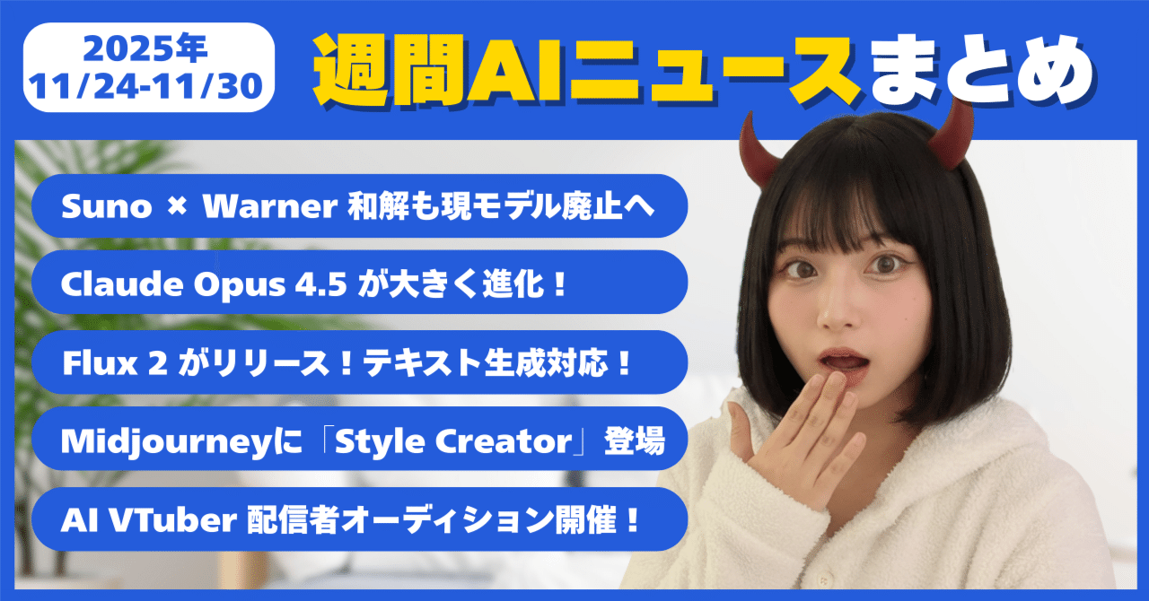 Suno無料DL終了の衝撃…!最強プログラマーAI「Claude Opus 4.5」やFlux 2など【週刊AIニュース】